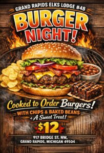 COOK TO ORDER CREW IS BACK, and it’s Burger Night at the lodge this week!! 1/3 lb fresh Sobie burger cooked your way with your choice of swiss, American or pepper jack and toppings of lettuce, tomato, onion, olives, pickles, ketchup, mustard or mayo! Add on grilled caramelized onion or sautéed mushrooms for $1 each. Burger dinner includes baked beans, potato chips and a sweet treat! All for $12 To ensure we have enough fixins’, please call Diane at 616-723-2763 with your reservation by Wednesday at noon!